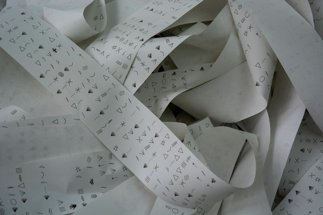 Pour la réalisation de cette installation générative, une intelligence artificielle a été entraînée à inventer des mythes sur le futur de l’humanité, qu’elle oralise au moyen d’une voix de synthèse. Ces récits, qui offrent une impression de familiarité en raison de la place qu’occupent les mythes dans notre inconscient collectif, sont retranscrits simultanément en signes préhistoriques par une sténotype robotisée – un dispositif permettant d’archiver des histoires qui, par essence, relèvent de la tradition orale. L’archéosténographe fonctionne selon une méthode d’écriture rapide qui utilise la phonétique pour transcrire les sons de la parole en temps réel. Ici, les 36 phonèmes de la langue française ont été remplacés par autant de symboles datant du Paléolithique, suivant une grammaire développée par Julie Hétu dans son essai "L’écrivain préhistorique". Aboutissement de six ans de recherches doctorales sur l’origine du chant et de l’écriture, elle y étudie la récurrence des motifs abstraits dans l’art pariétal, qui abondent dans la plupart des ensembles préhistoriques et que plusieurs chercheurs considèrent comme une forme "d’écriture primitive". Inspiré par le modèle archétypal de la pierre de Rosette ayant permis de déchiffrer les hiéroglyphes, ce projet est né d’un désir plus poétique que scientifique d’arriver à lire ou écrire des récits en symboles préhistoriques.